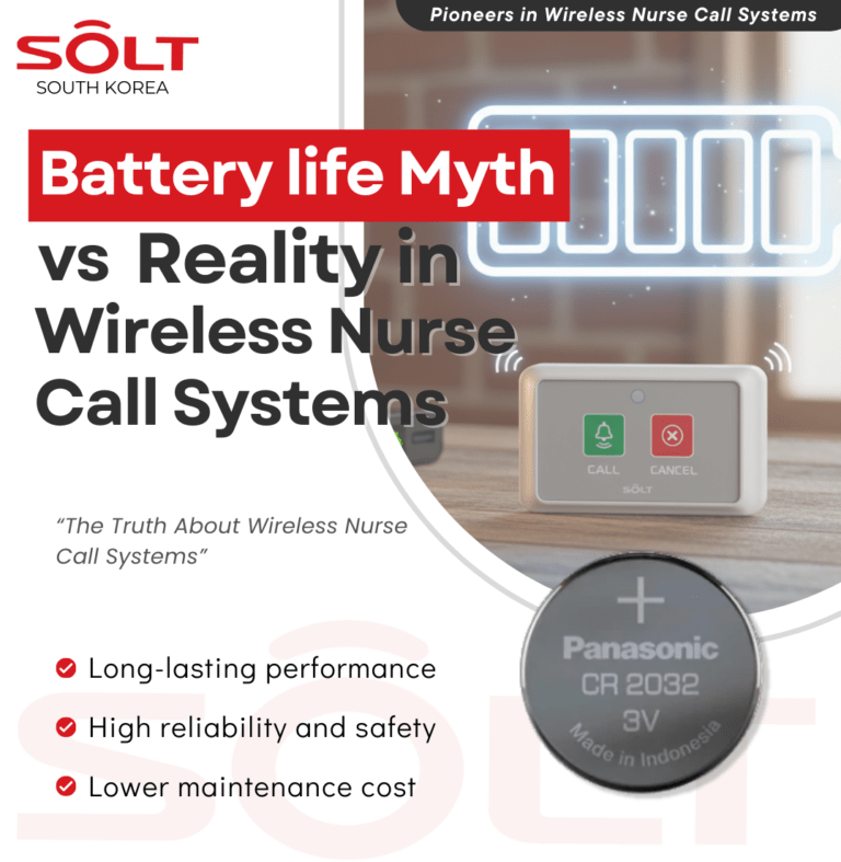 SOLT Wireless Call Bell Systems are designed to run for 18 to 24 months on simple coin batteries, even with an average of 15 presses a day. These batteries are inexpensive, easy to replace and widely available. No specialist tools, no complex procedure, no technician needed.
